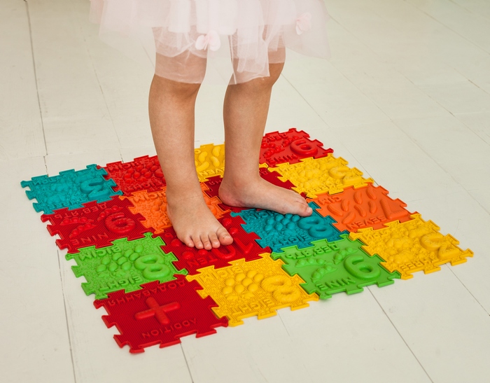 A talpmasszázs mellett a puzzle elemek segítségével megtaníthatja a gyerekeket számolni, példákat alkotni. A gyümölcsök és zöldségek száma megfelel az elemen lévő számnak – ez segít a számolásban és felkelti a gyermek figyelmét.