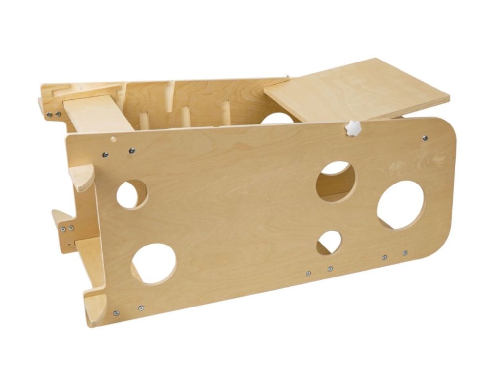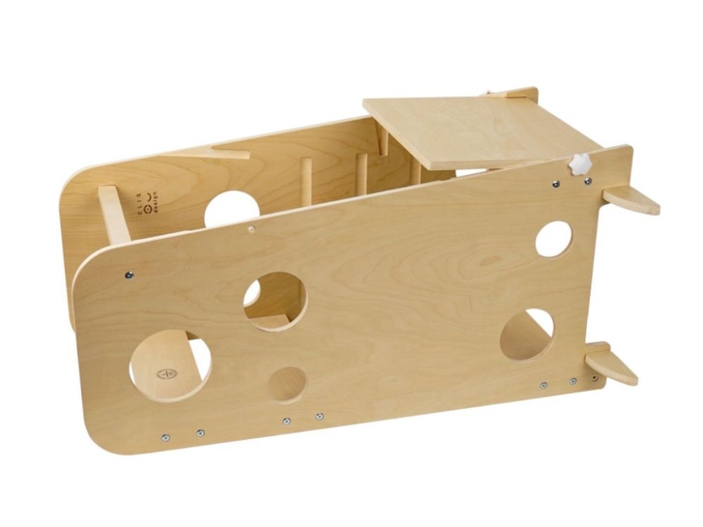 A tanulótorony néhány mozdulattal praktikus asztal–szék kombinációvá alakítható. A kihúzható platform egyik oldala egyenes, a másik enyhén döntött, így többféle módon használható alkotáshoz, rajzoláshoz vagy étkezéshez.