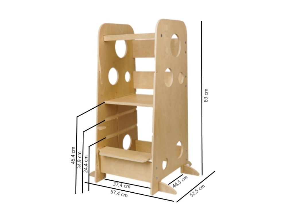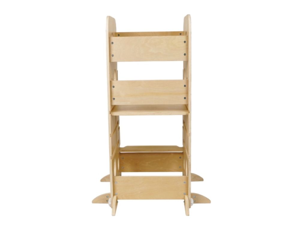 A platform három magassági szintre állítható, a lépcső két pozícióban rögzíthető, így a tanulótorony valóban együtt nő a gyermekkel. Letisztult, esztétikus kialakítása miatt nemcsak praktikus eszköz, hanem szép bútordarab is a gyerekszobában vagy a konyhában.