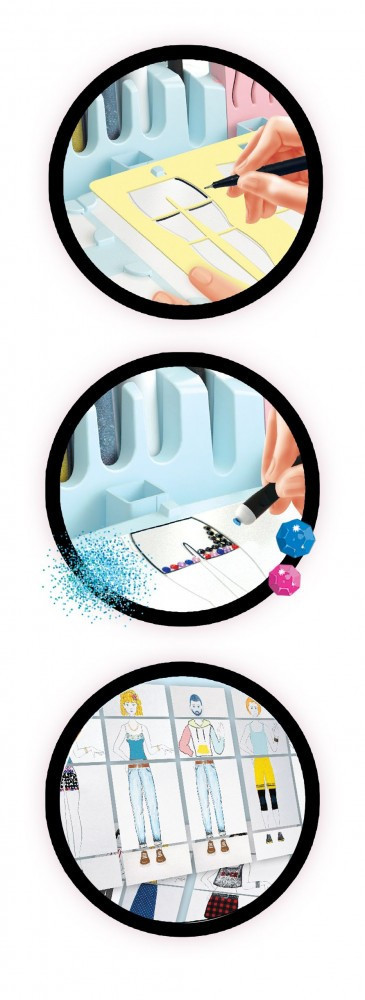 Kapcsold be a fényt, helyezd be a sablont, majd rajzolj ruhákat a figurák körvonalaira. Ezután díszítsd őket az öntapadós textilekkel, csillámmal és a készletben található számos egyéb kiegészítővel. A megtervezett frizurákat, felsőket, alsókat és cipőket egyszerűen csúsztasd be a könyvbe – lapozgass, és minden nap új megjelenést alkothatsz!