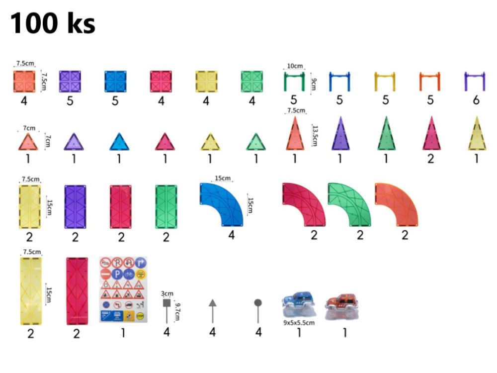 (26× négyzet, 8× téglalap, 6× egyenlő szárú háromszög, 6× egyenlő oldalú háromszög, 4× lejtő, 10× íves elem, 26× oszlop, 2× autó, 12× jelzőtábla)