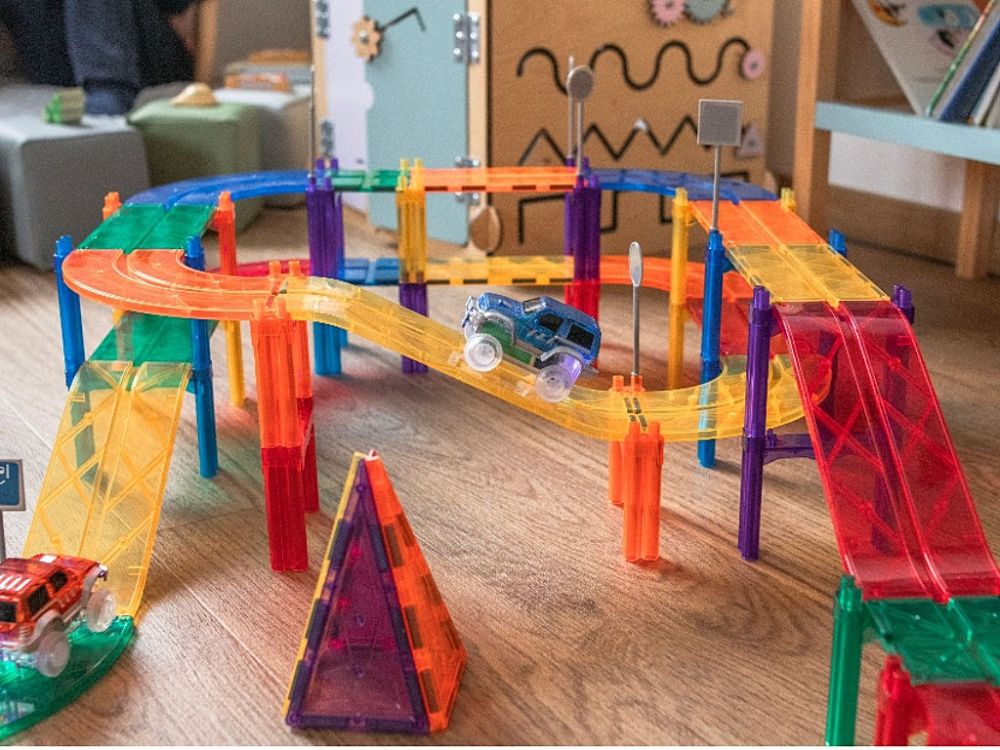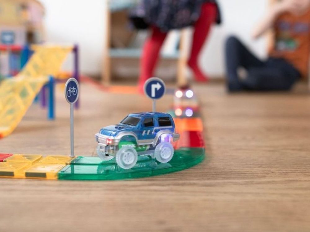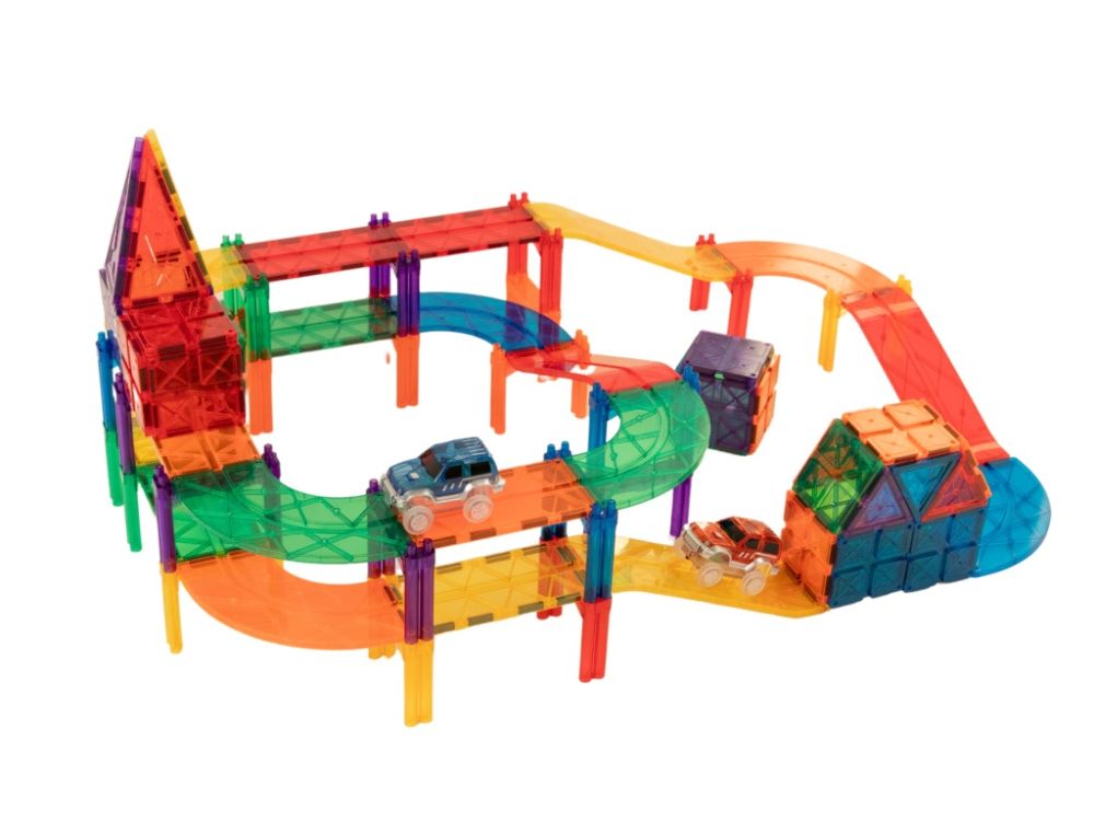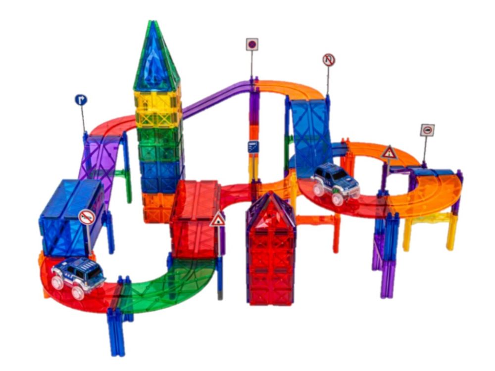 A készlet számos színes elemet tartalmaz utak, hidak és különböző pályák megépítéséhez, amelyeken a mellékelt két kisautó közlekedhet. A háromszögek, négyzetek, téglalapok, íves és lejtős elemek, tartóoszlopok és közlekedési táblák segítségével akár többszintes építmények is létrehozhatók. A gyerekek saját kis várost, úthálózatot vagy kalandos pályát tervezhetnek, miközben fejlődik térbeli gondolkodásuk és problémamegoldó képességük.