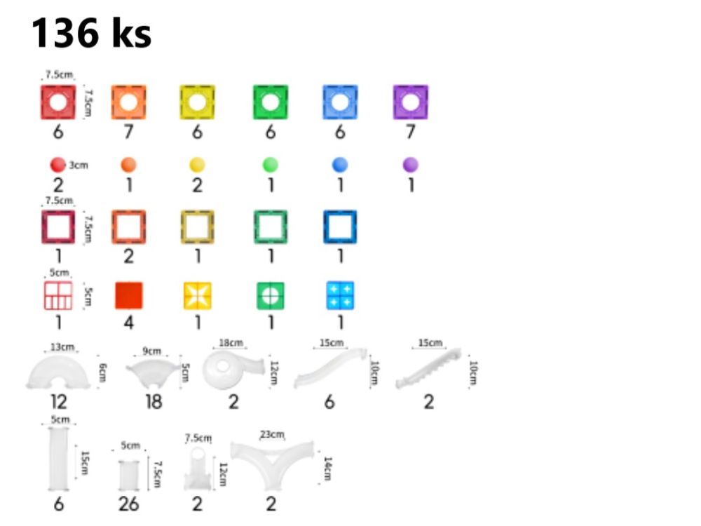 A készlet háromszögeket, négyzeteket, különböző formájú alagutakat és kétkerekű alvázakat is tartalmaz, így járművek is építhetők. A vidám színű elemekkel a gyerekek szabadon alkothatnak, újra és újra áttervezhetik pályáikat, miközben fejlődik kreativitásuk, koncentrációjuk és problémamegoldó képességük. Az építés és a guruló golyók megfigyelése egyszerre fejleszti a finom- és nagymotoros készségeket, valamint a türelmet és a térbeli gondolkodást.