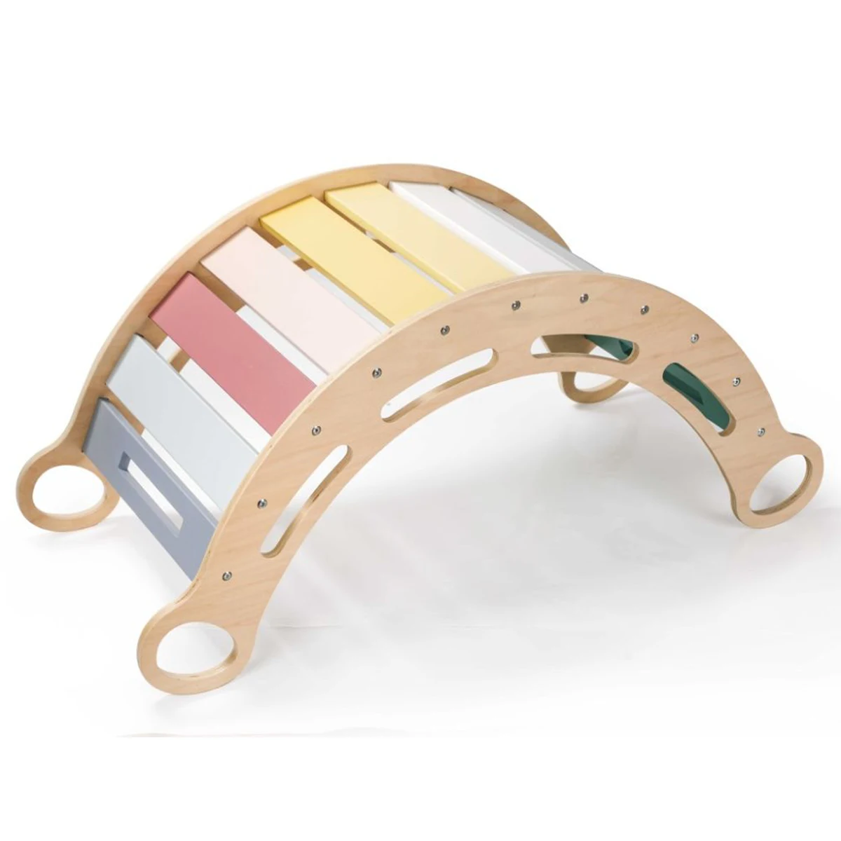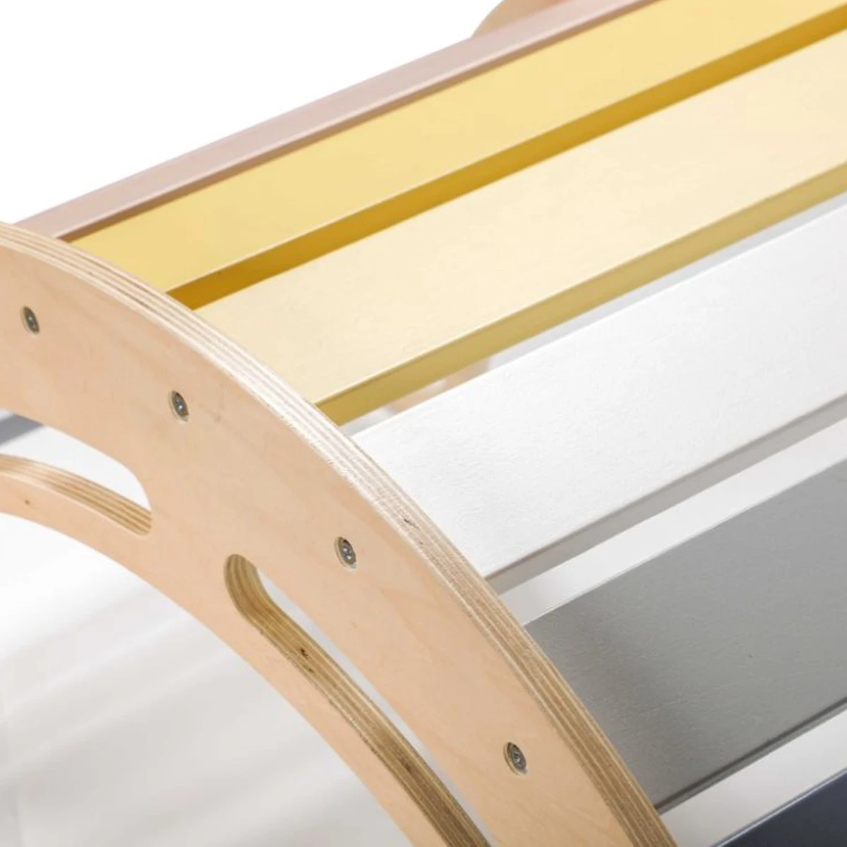 A nagy, fából készült Montessori 5 az 1-ben hinta egy sokoldalú mozgásfejlesztő játék, amely hintaként, mászókaként, csúszdaként, hídként vagy búvóhelyként is használható. Természetes fából, pasztellszínű elemekkel készült, így nemcsak esztétikus, hanem biztonságos és környezetbarát is. Segíti a gyermek mozgáskoordinációjának, egyensúlyérzékének és izomzatának fejlődését, miközben vidám és aktív játékra ösztönöz.