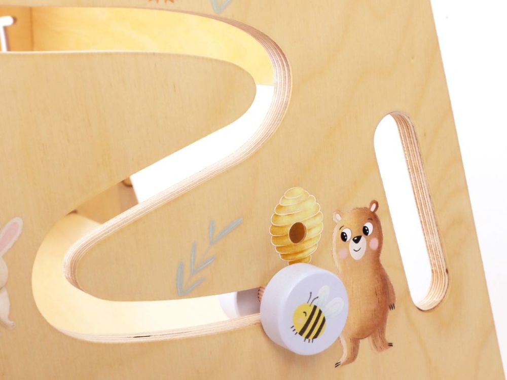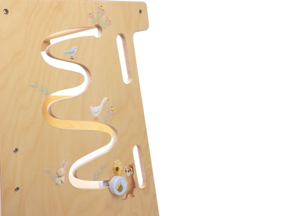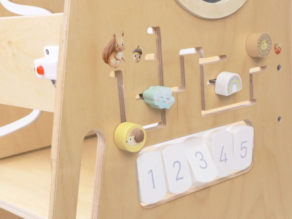 A torony nemcsak biztonságos, hanem segíti a gyermek fejlődését is. Az integrált játékos elemek támogatják: